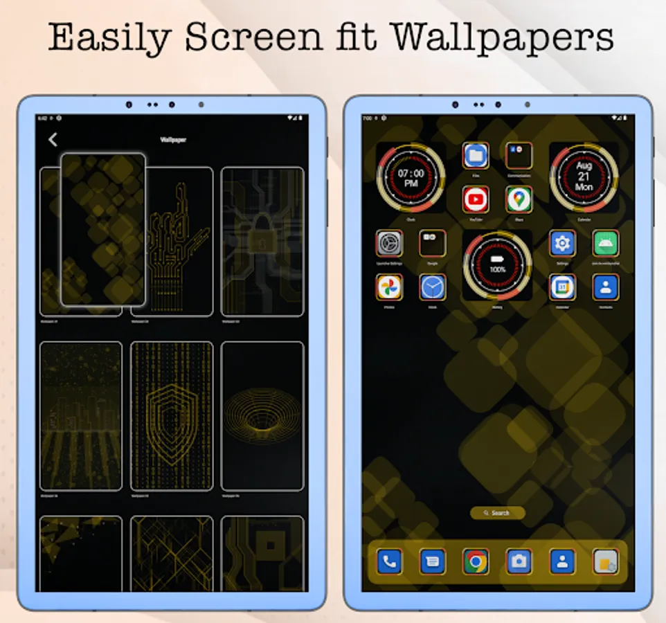 Enjoy the Hi-tech wallpaper feature that adapts its color to match your chosen theme. You can also adjust the brightness of the wallpaper or apply your own images from the gallery.