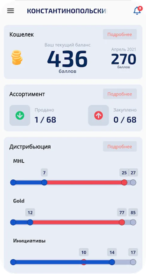 Incentive program for traditional retailers. Earning points for the purchase and sale of products of program partners, tests for product knowledge.