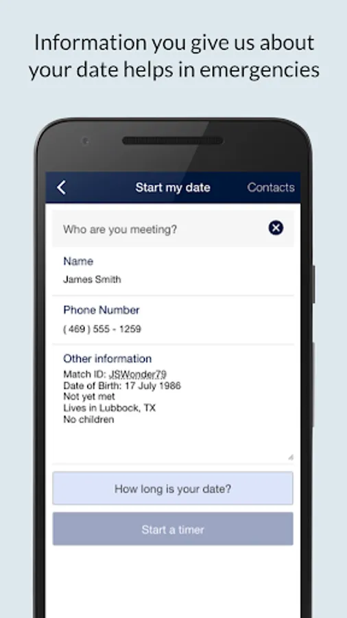 When you want to meet a new date, tell us who you are meeting. You can provide us with their online dating ID, name, phone number, date of birth – and any additional information that will help the emergency responders if there is an issue.