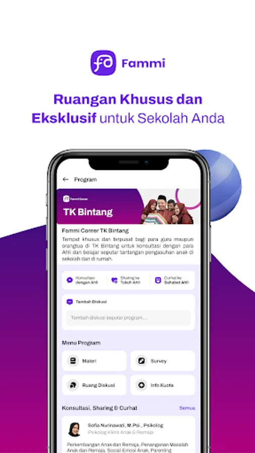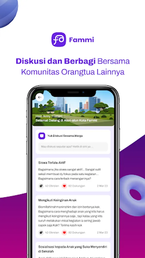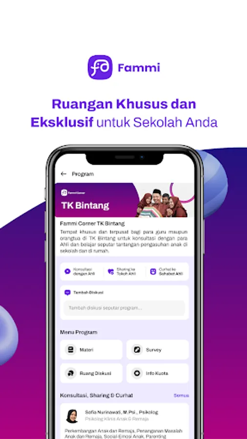Fammi also brings KOTA (Skilled and Expert Community) in the app. KOTA Fammi is a community movement that invites every element of a caring society (CARE) to actively participate in contributing to building generations by sharing stories and experiences, discussing and providing solutions to family problems.