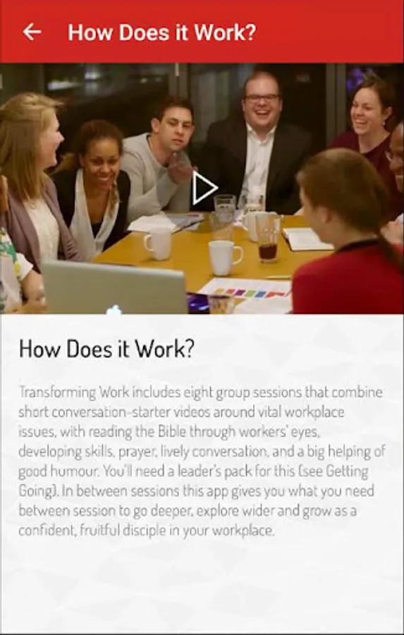 Transforming Work is an innovative, liberating resource for Christians in the workplace. It brings together a group of like-hearted people for eight sessions over a year, creating space between gatherings to reflect, to try things out and to pray… and leaving time for God to do what only he can do.