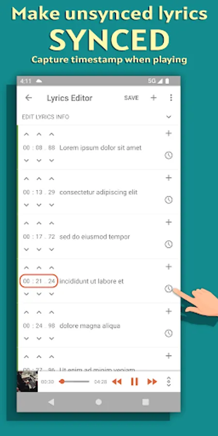 - With unsynced lyrics, start play the audio. When it is playing, click the Time icon on each row to capture timestamp for that row from the current progress.