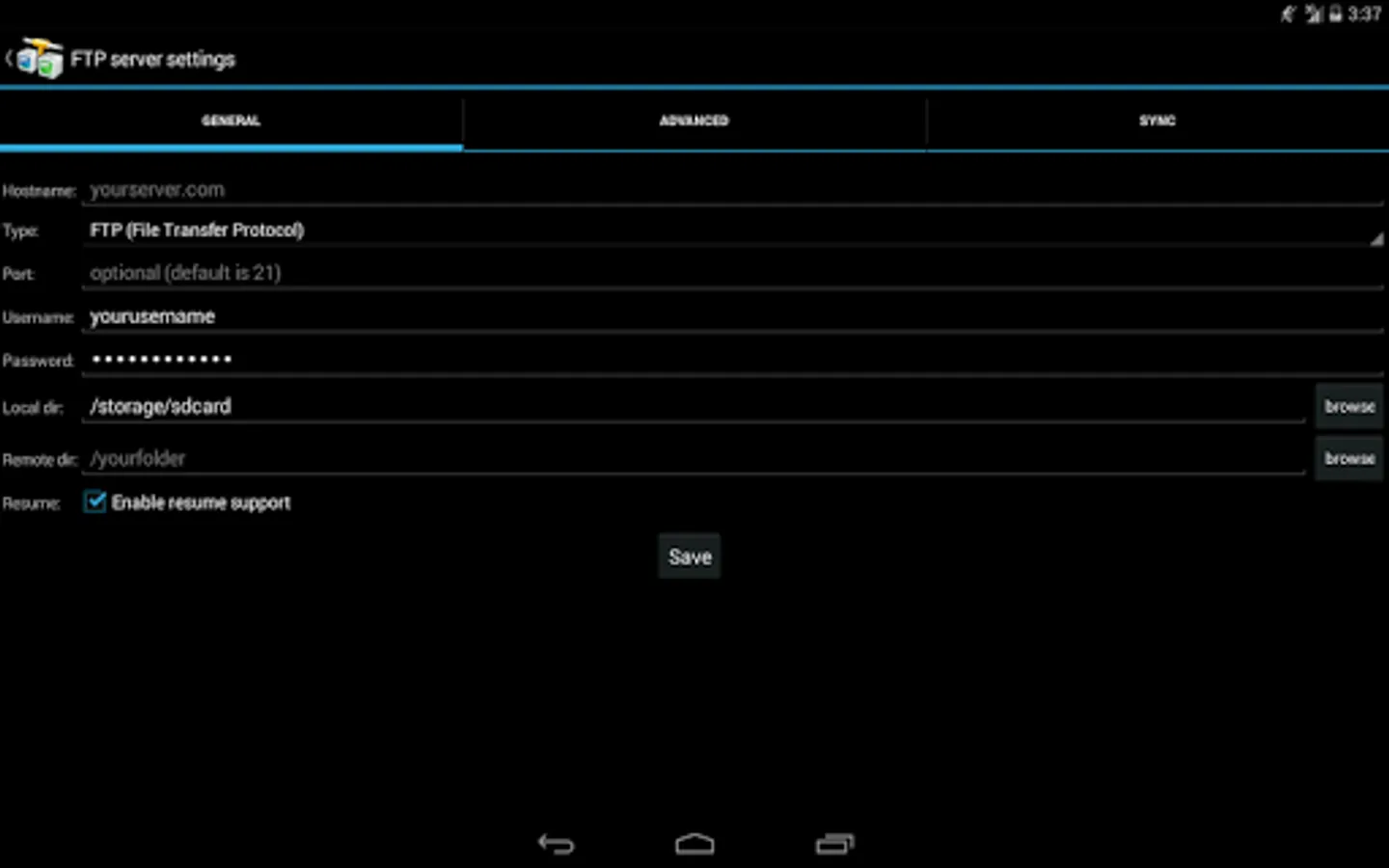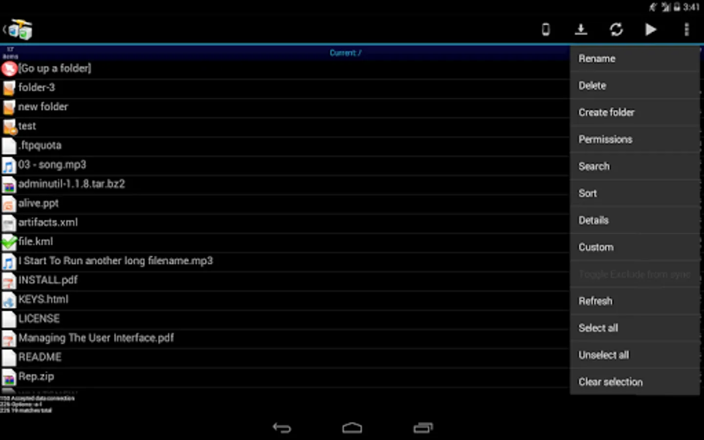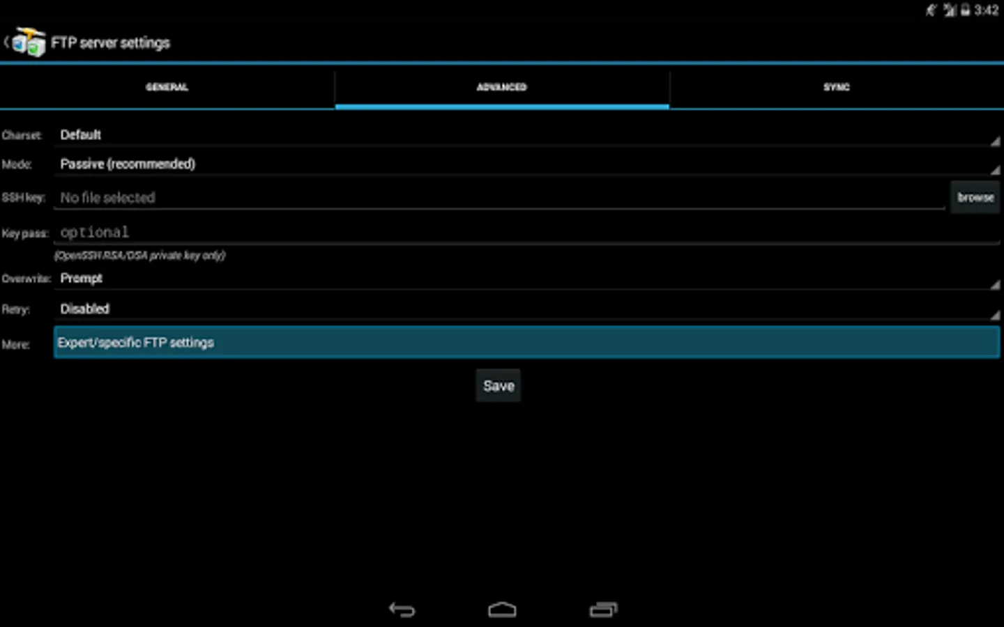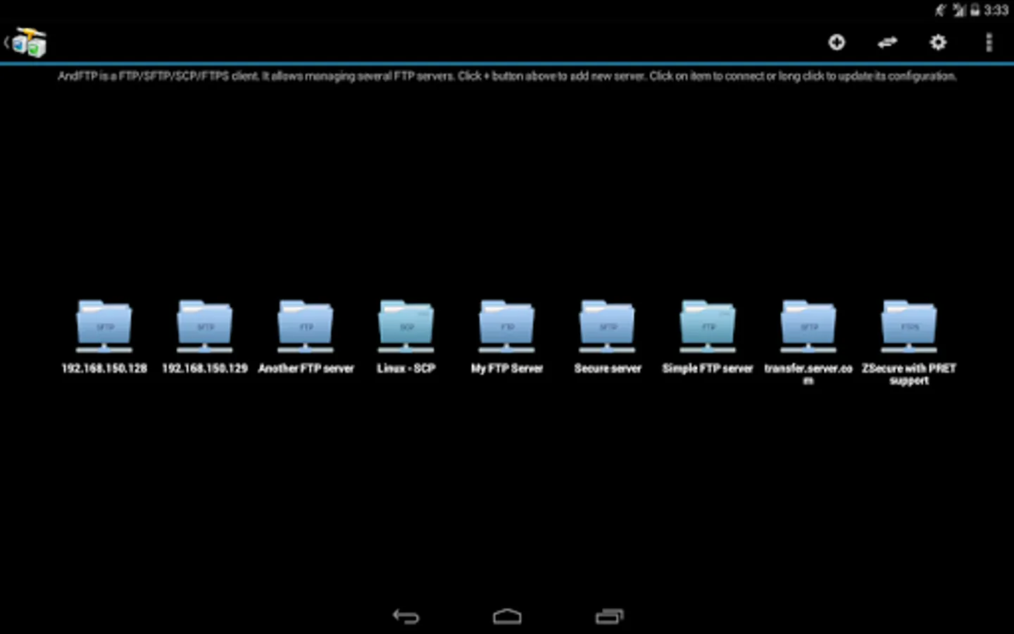 AndFTP is a FTP, FTPS, SCP, SFTP client. It can manage several FTP configurations. It comes with both device and FTP file browser. It provides download, upload, synchronization and share features with resume support. It can open (local/remote), rename, delete, update permissions (chmod), run custom commands and more. SSH RSA/DSA keys support. Share from gallery is available. Intents are available for third party applications. Folder synchronization are available in Pro version only.