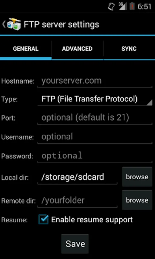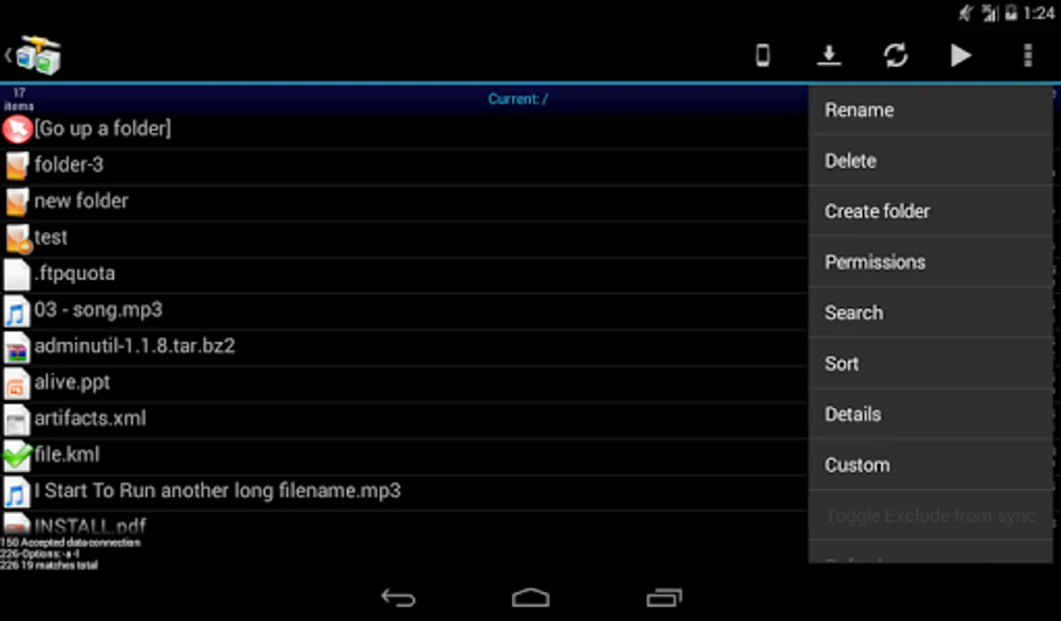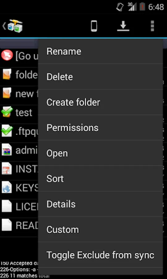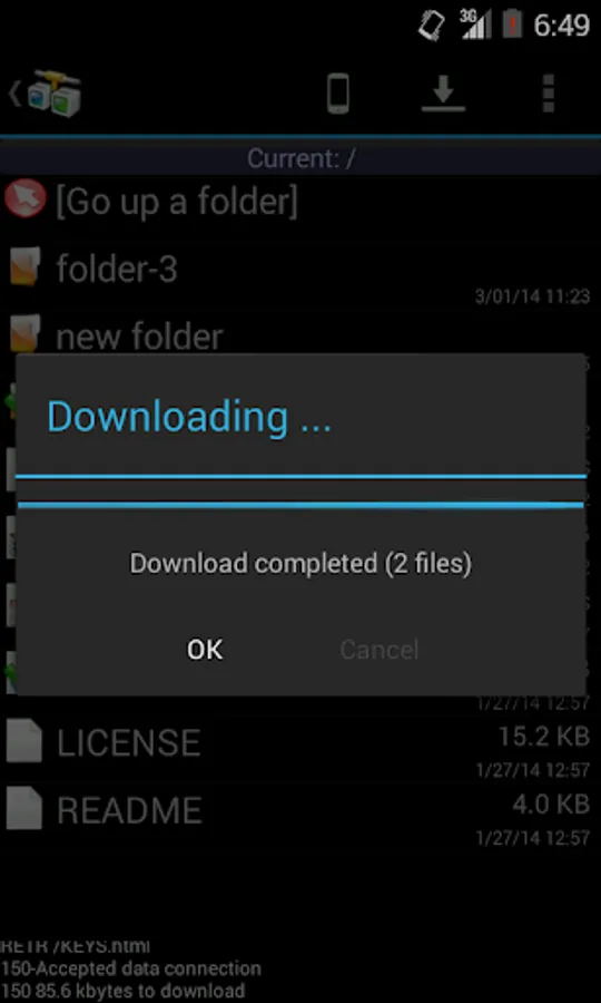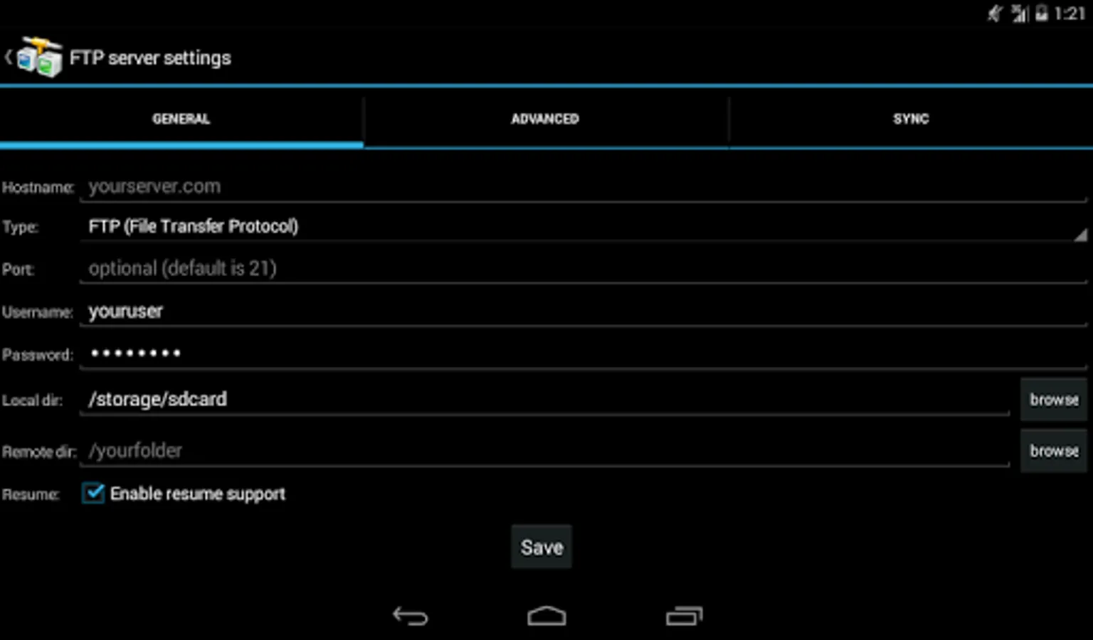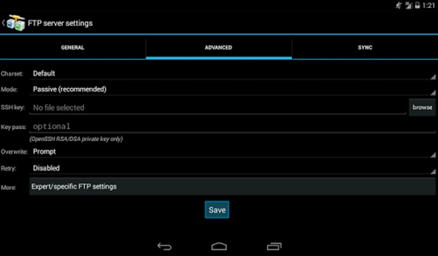 AndFTP is a FTP, FTPS, SCP, SFTP client. It can manage several FTP configurations. It comes with both device and FTP file browser. It provides download, upload, synchronization and share features with resume support. It can open (local/remote), rename, delete, update permissions (chmod), run custom commands and more. SSH RSA/DSA keys support. Share from gallery is available. Intents are available for third party applications. Folder synchronization are available in Pro version only.