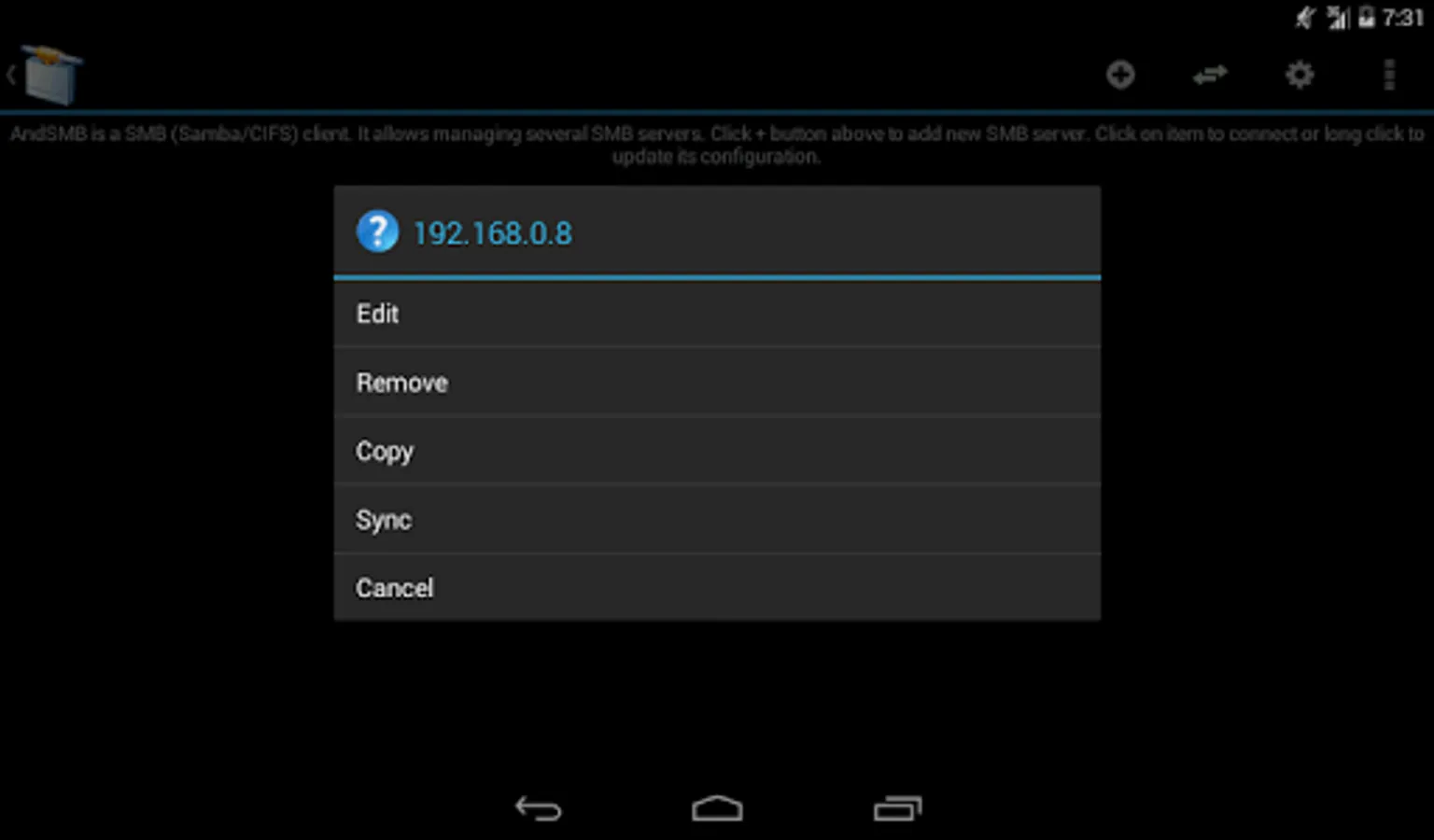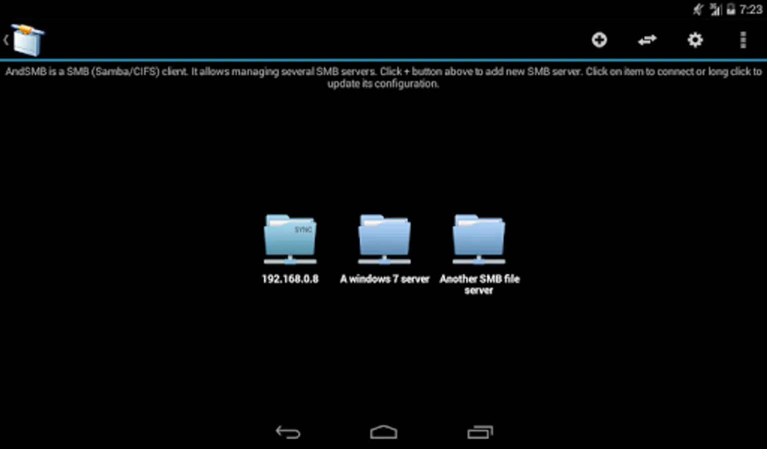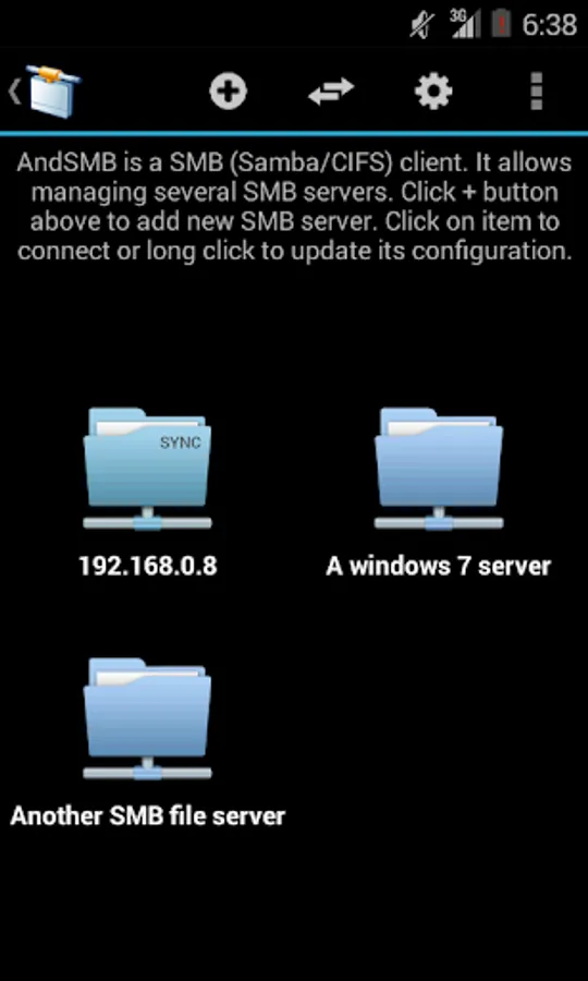 AndSMB is a SMB (Samba/CIFS) client for Android devices. It allows connecting to shared folders hosted on Windows or Samba servers over Wifi/3G/4G. It allows managing several connections with authentication. It comes with both a device file browser and a SMB file browser. It provides download and upload support for files and folders. It can synchronize folders. You can rename, delete, get file details, create folders open local and remote files. It comes with share feature for gallery. WINS server, LMHOSTS and broadcast address options are available for name resolution. Browse and transfer intents are available for third party applications. Root access is not needed.