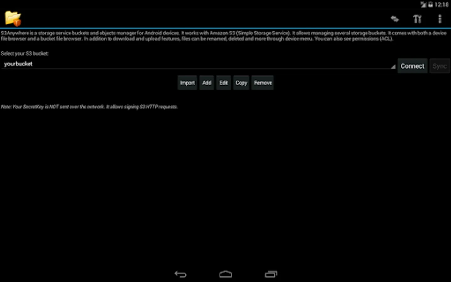 BucketAnywherePro is an S3 file manager for Android devices. It allows managing several S3 buckets from Amazon cloud storage service. It comes with both handset and S3 file managers. It provides download, upload and folder synchronization features. Resume support for download is available. File manager allow renaming, deleting, and copying files. You can view permissions (ACL) on each file.Share S3 files with optional expiration date is available. It works with any S3 compatible services such as HostEurope, Aruba and more.