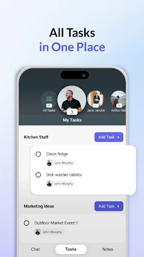 A quick swipe shows you the task list to keep track of the group's progress, and simple integrated Chat lets you discuss tasks and keep things moving!