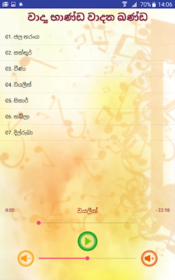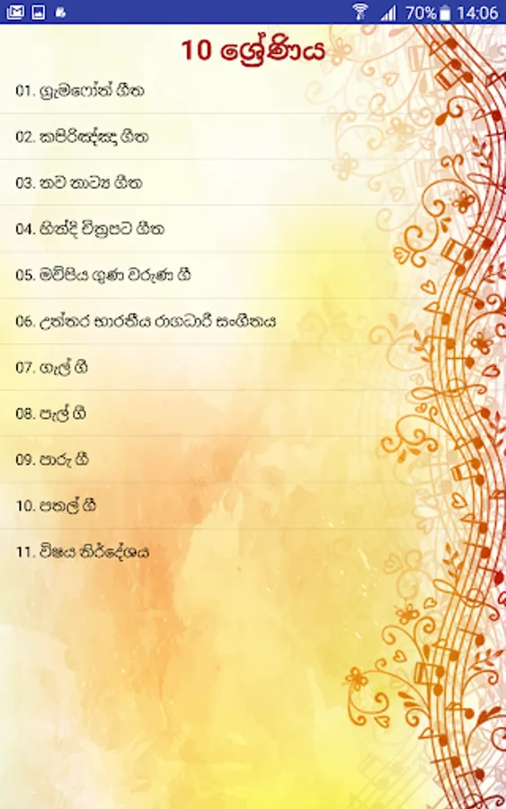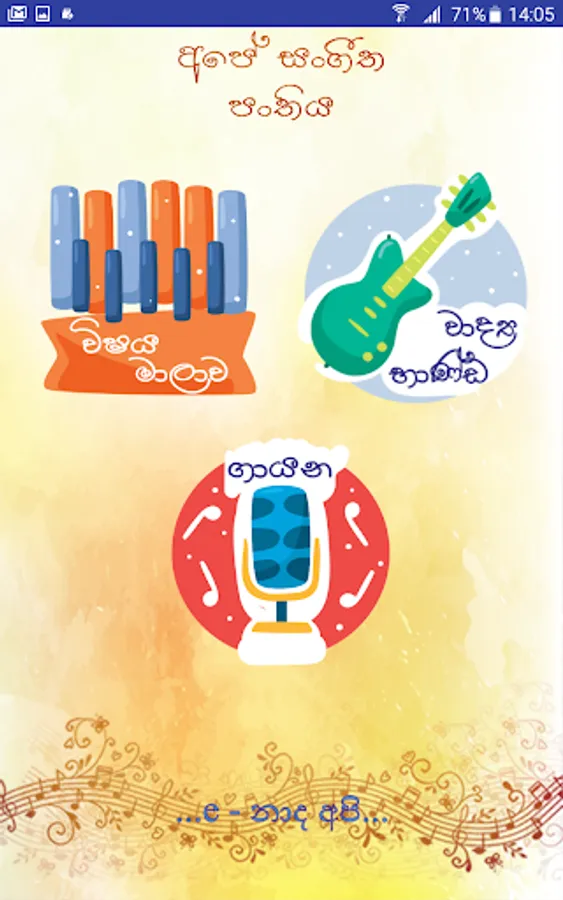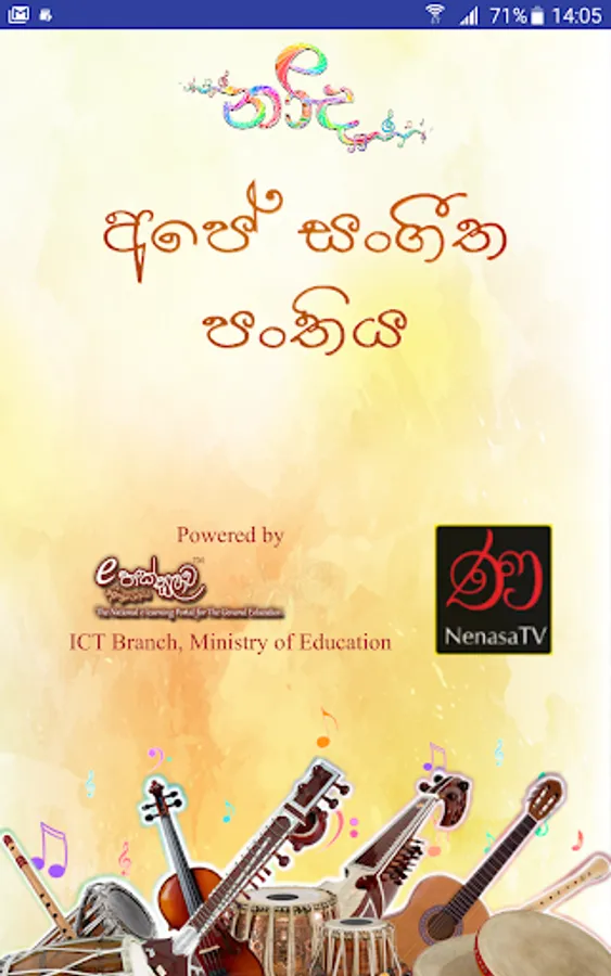 e-learning and Nenasa Education unit decided to develop Android Application for cover Eastern Music Subject in the local school syllabus. Because of eastern music subject takes 4th place that students failing G.C.E. (O/L) examination. The reason is most of school’s does not have enough facilities for practices and listen to the relevant instruments and songs. Even they can’t practice or listen those after they leave the school. And many schools do not have any music teacher. Present time, mostly everyone has smart phones, even school students.