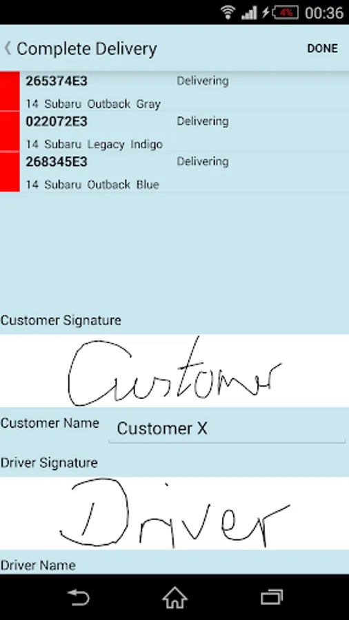 Vehicle Mobile Application is a tool for vehicle delivery drivers which enables them to receive details of vehicle loads for pickup and delivery, to scan VIN barcodes when loading vehicles, record loading and unloading vehicle damages in detail (with photo capture), synchronize with central office system and make deliveries with signature capture direct on the mobile device. Features include: