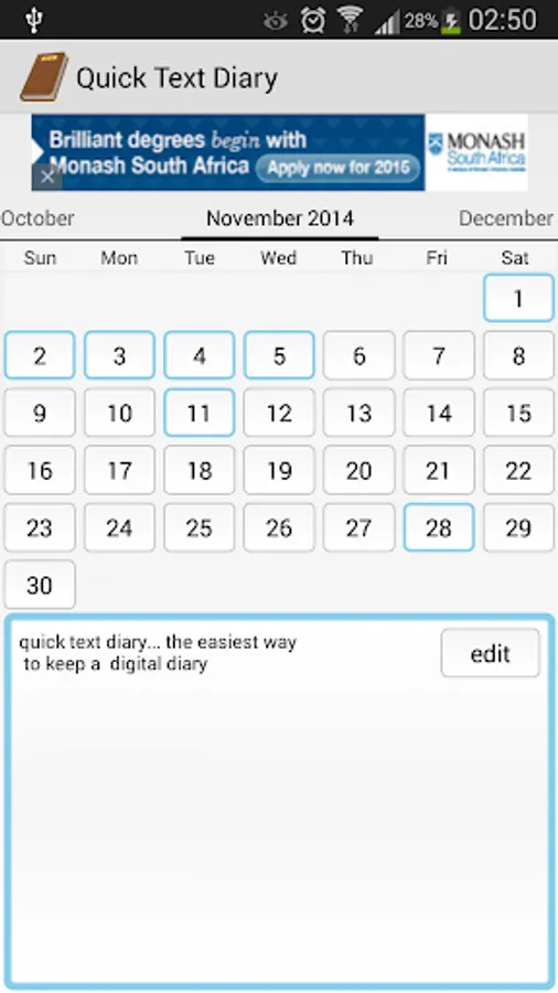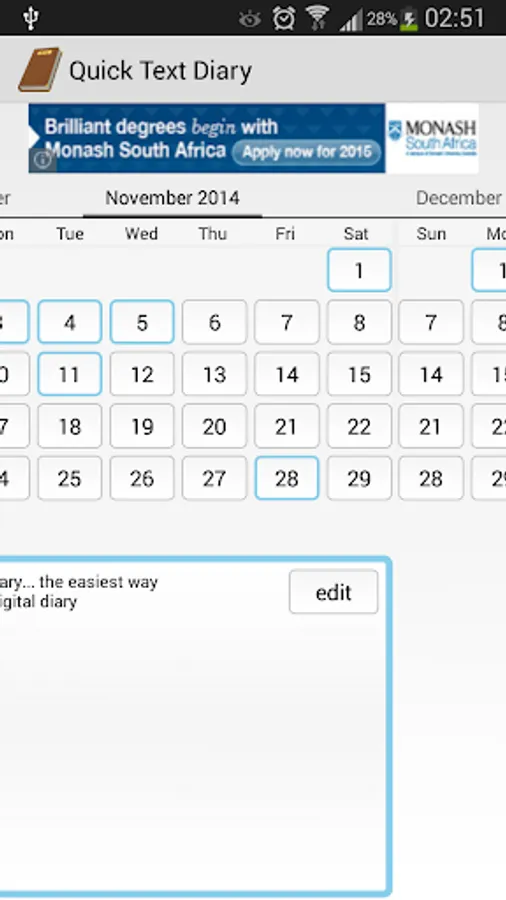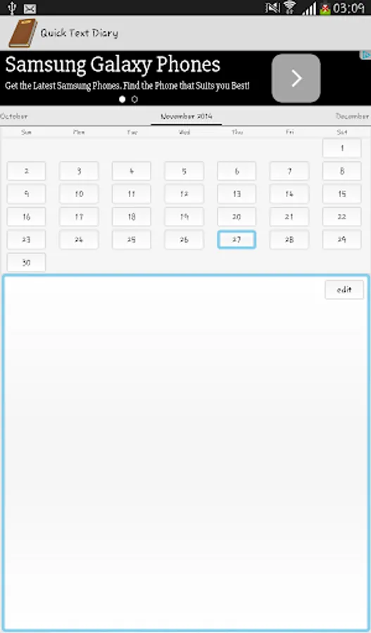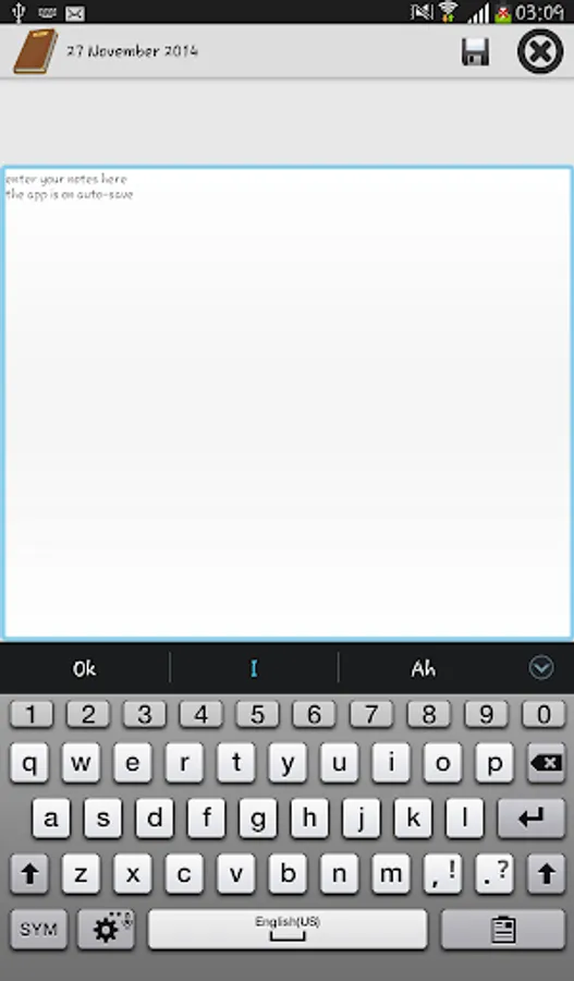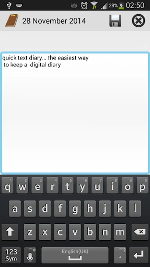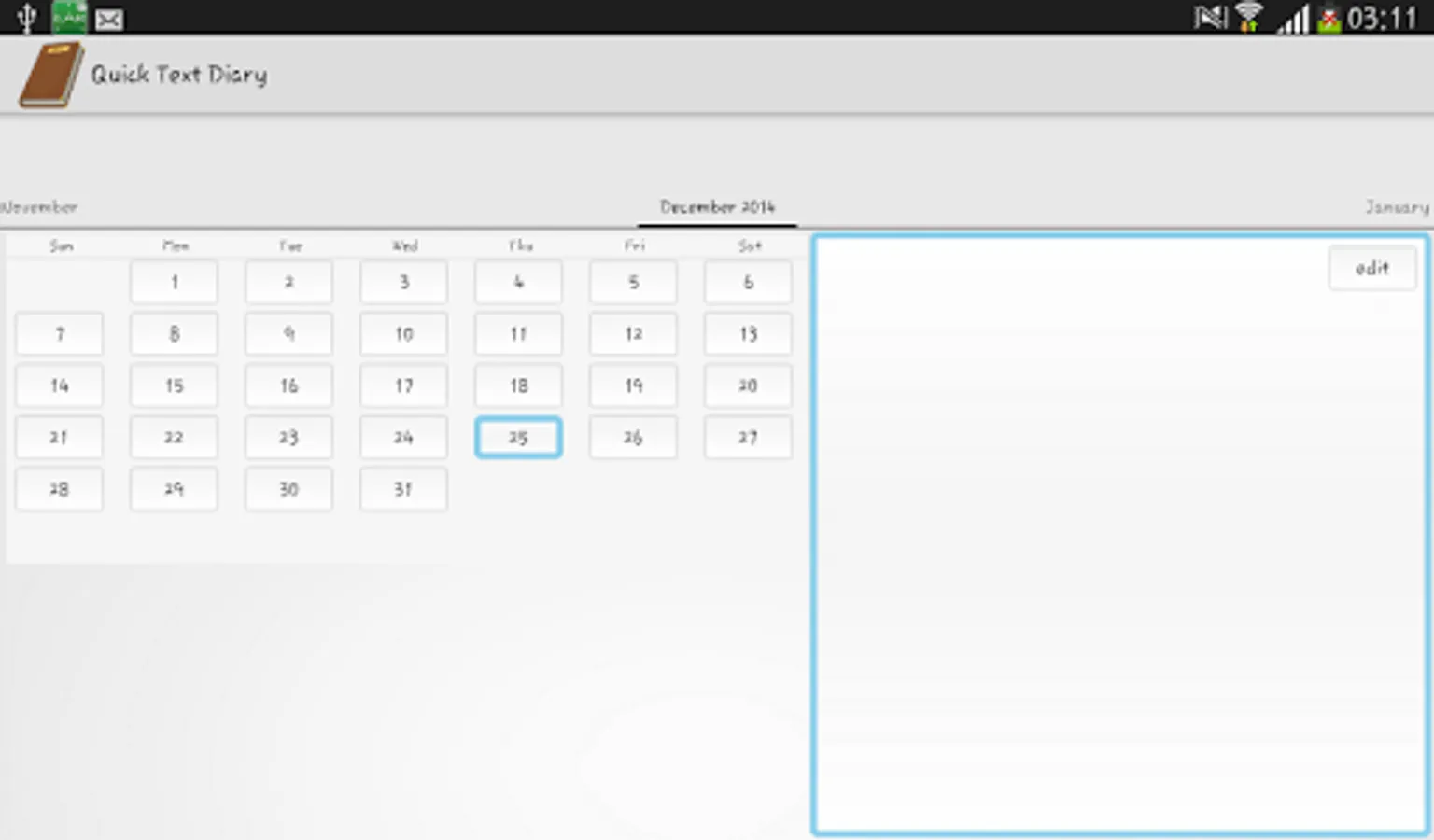 Quick text diary is an easy diary to use because every thing you need is one click way. You diary entries are auto saved.