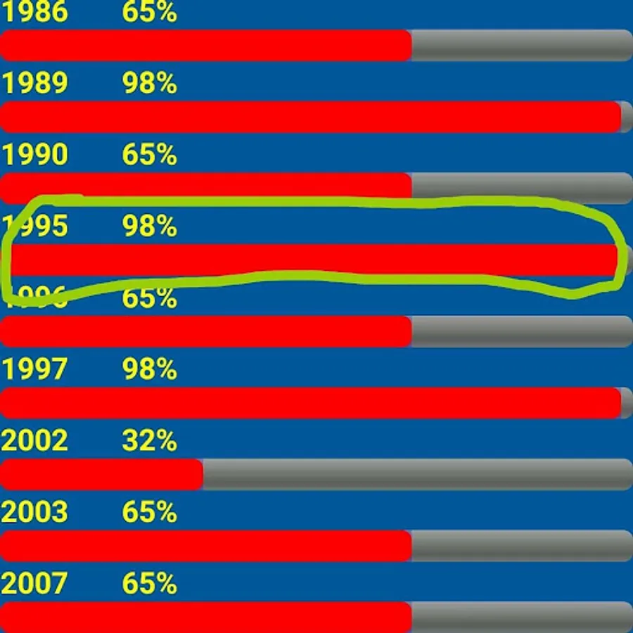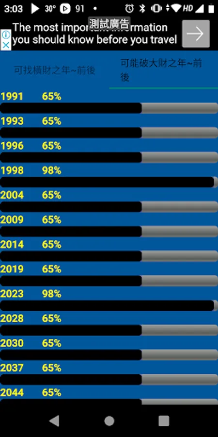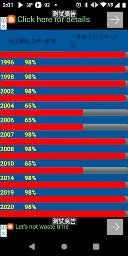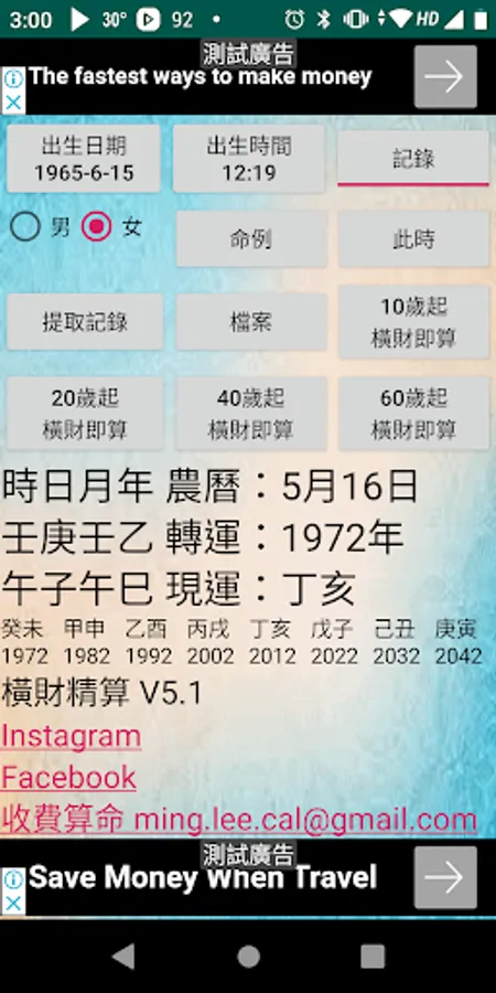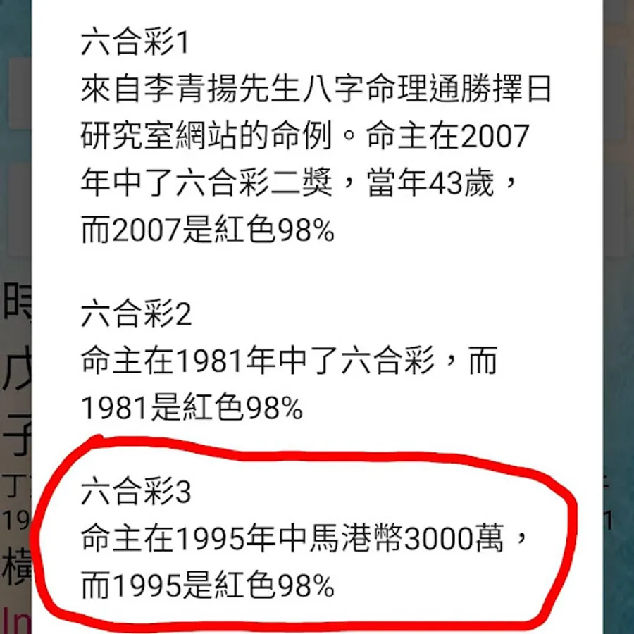 來自李青揚先生八字命理通勝擇日研究室網站的命例。命主在2007年中了六合彩二獎,當年43歲,而2007是紅色98%