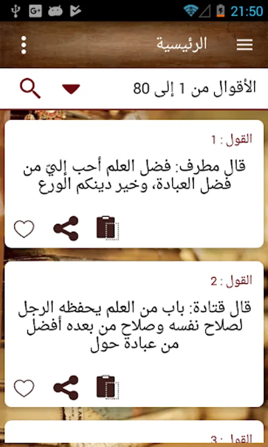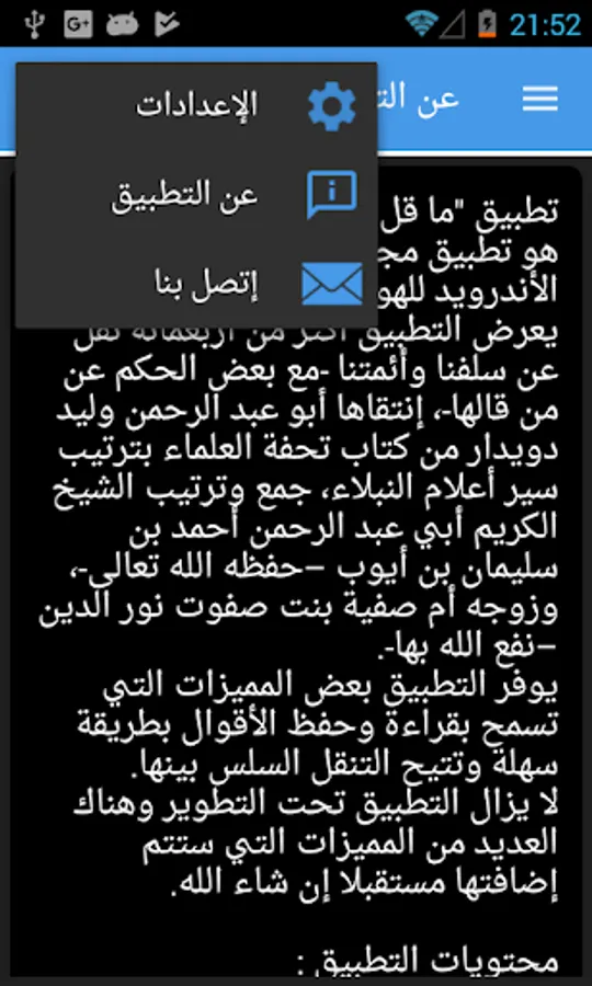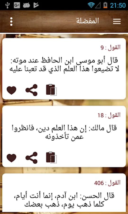 The application displays more than four hundred for the transfer of our ancestor and imams -With some judgment about the Qalha-, carefully selected Abu Abdul Rahman Walid Dwedar from the book masterpiece scholars arranged the course of the nobles, the collection and arrangement of Sheikh Karim Abu Abdul Rahman bin Sulaiman bin Ayoub God Almighty -hfezh , Wife and mother descriptive girl Safwat Nour El Din -nf God Bha-.