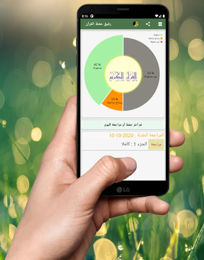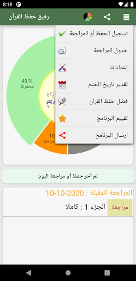 هذا التطبيق يساعدك على تسجيل الحفظ و المراجعة ويتضمن إحصائيات حول نسبة ما تحفظه وكذلك نسبة ما قد يكون منسيا لعدم مراجعته بانتظام، كما يتضمن تذكيرا بآخر مرة حفظت فيها القرآن الكريم أو راجعته