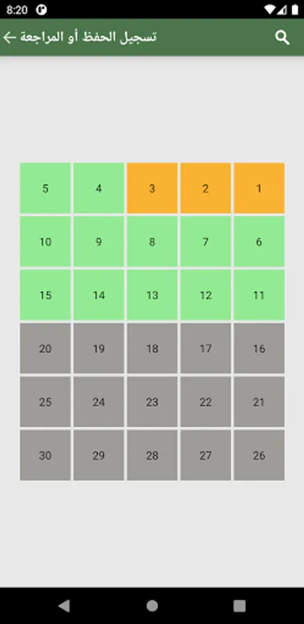 يقدم هذا التطبيق نمطين لتتبع الحفظ. عن طريق الأحزاب والأثمان أو عن طريق الأجزاء والصفحات كما يعتمد على الألوان لتيسير استعماله ولكي يكون واضحا لكل مستعمليه