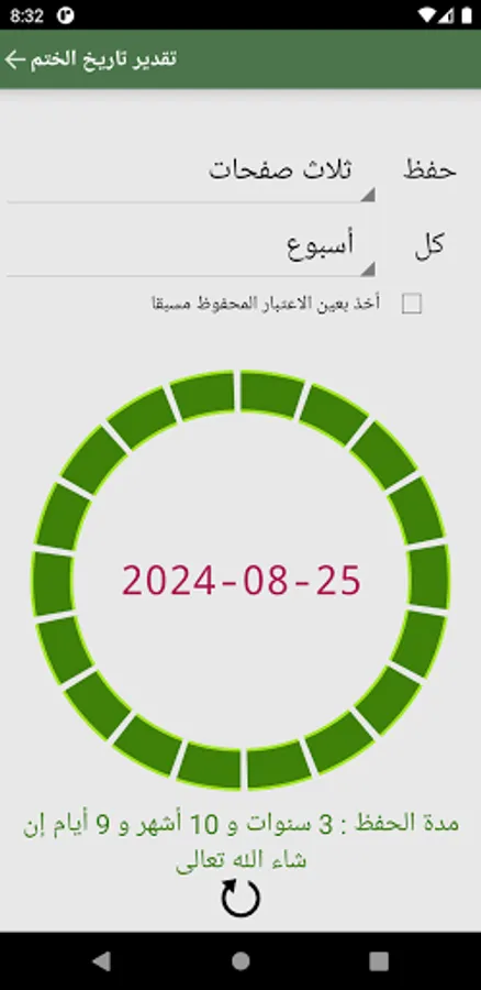 يقدم التطبيق حاسبا لتقدير تاريخ الختم انطلاقا من حجم الحفظ ودوريته