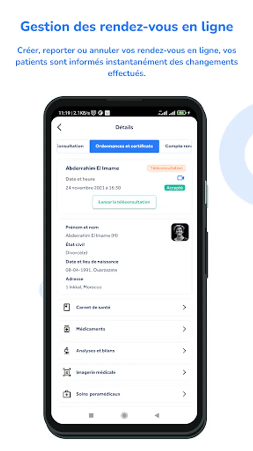 - Manage your agenda (creation, cancellation, postponement of appointments)