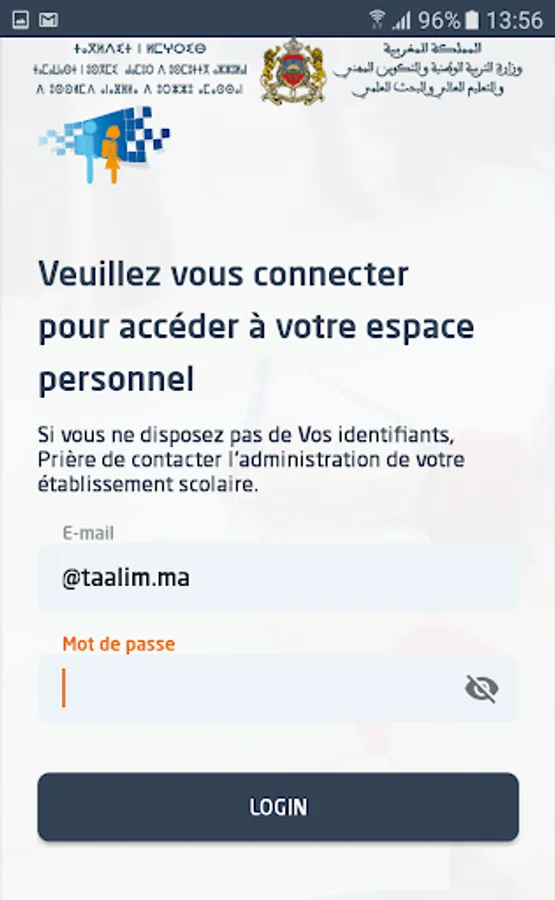 After downloading the application, you will need to use the codemassar@Taalim.ma account and the password you use to access the "Moutamadris" area in order to benefit from the services of the application.