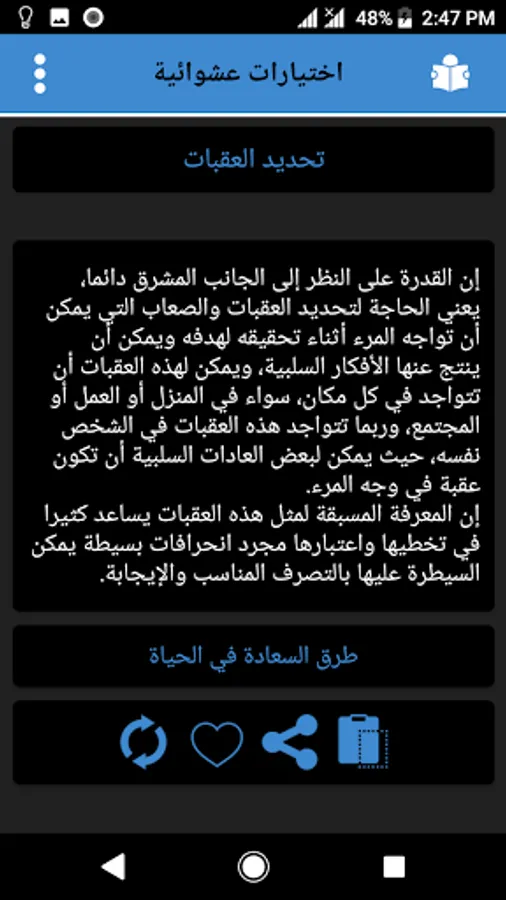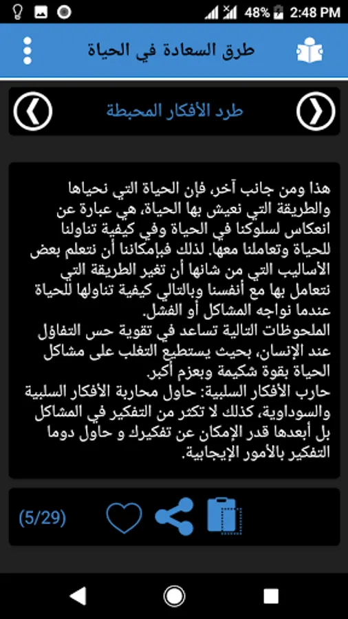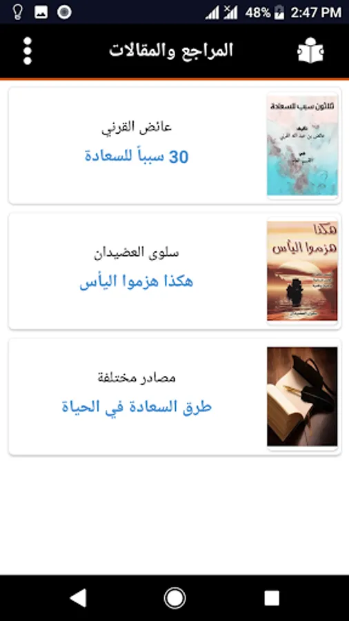 This application deals with the subject of true human happiness and ways to achieve it through pauses with the book "30 reasons for happiness" by Dr. Ayed Al-Qarni, and the book "Thus Defeated Despair" by Salwa Al-Adidan, in addition to many different articles on the ways of happiness in life.