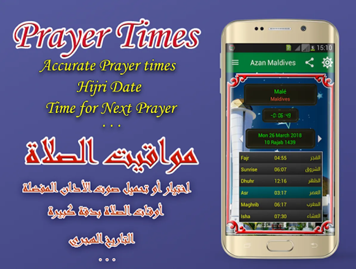 - View monthly prayer times with corresponding Hijri date is possible with azan Prayer time maldives.