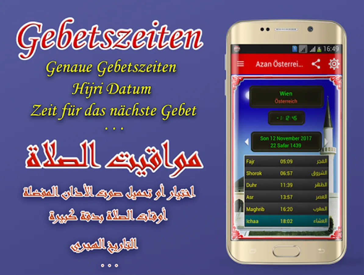 - View monthly prayer times with corresponding Hijri date is possible with adan Austria.