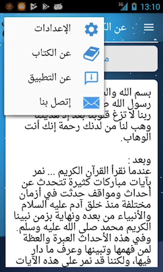 The application displays the book "90 personal story of the Koran," the author of "Abu Islam Ahmed bin Ali" full content, with the addition of some features that allows you to read and save the book points in an easy way and allow seamless mobility between his subjects.