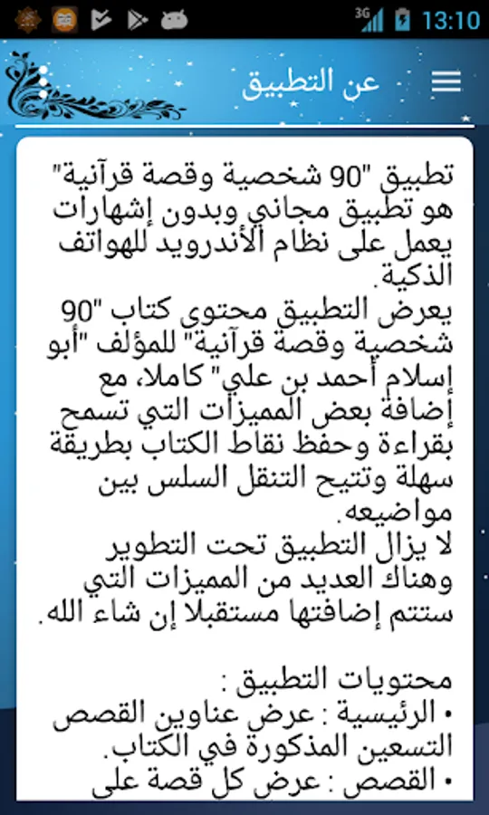 Apply "90 personal story of the Koran" is a free application without Ahharrat running on the Android system for smart phones.