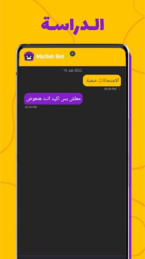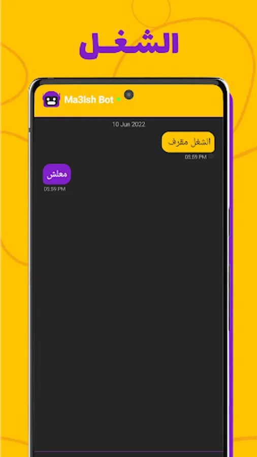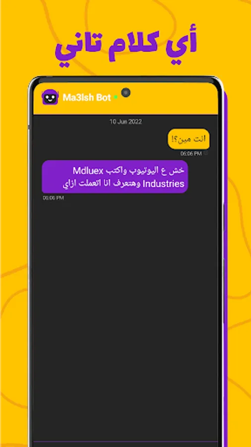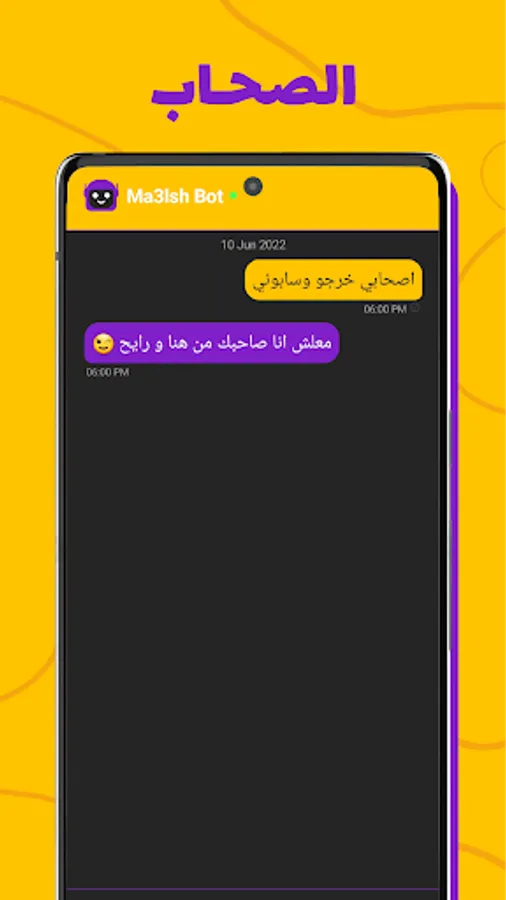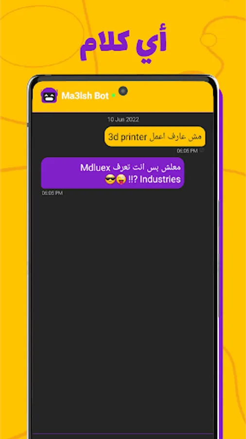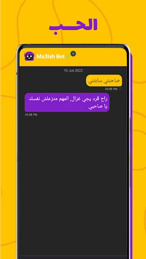 Ma3lsh Bot is a chatting bot that uses artificial intelligence to make you feel good and to tell you "Ma3lsh" whenever you need it.