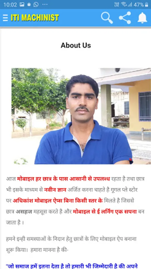 इस ऐप में ITI Machinist Trade के सभी महत्वपूर्ण प्रश्नों का समावेश किया है। यह आपको न सिर्फ शैक्षणिक परीक्षाओं बल्कि प्रतियोगी परीक्षाओं में मददगार साबित होगा । ट्रेड पर सरल भाषा में और संक्षिप्त जानकारी देने का प्रयास किया गया है।