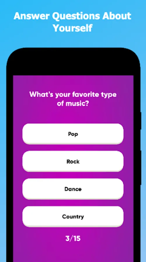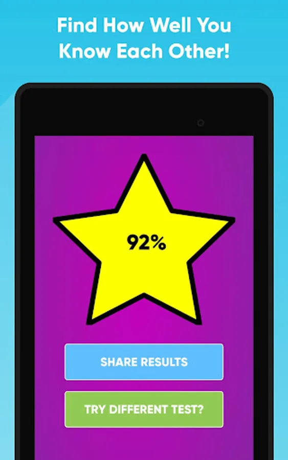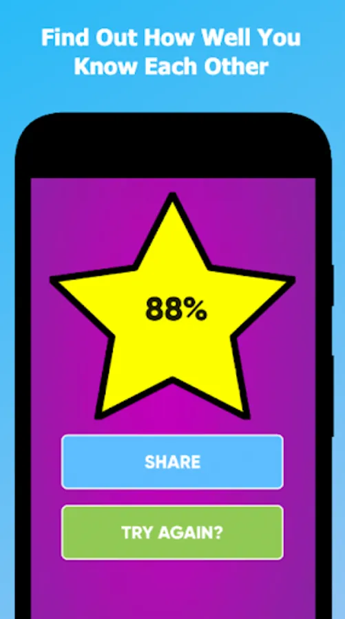 This quiz calculates how much you and your friend or couple know each other after answering a set of questions. To play, first answer questions about yourself. Then pass the device to the friend you are playing with and let them answer the same questions, trying to get their answers to match yours. At the end of the game you will get a total score of how well they know you!