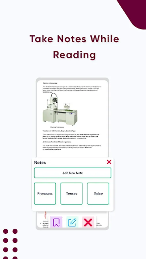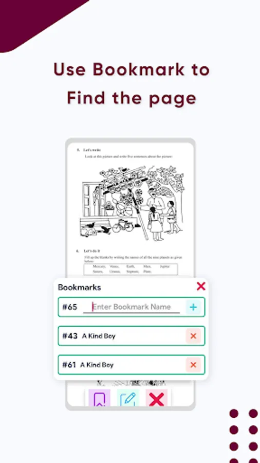 You can note down the essential points as simple notes in this app while studying, which is a great advantage for you. By using the bookmarks feature you can easily find the areas and pages where you left off.