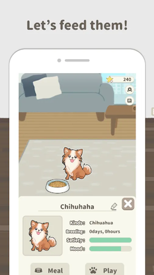 As time passes, the animal's "Satiety" and "Mood" will decrease, so feed it and play with it to keep it happy.