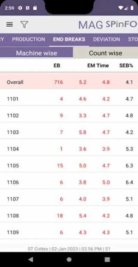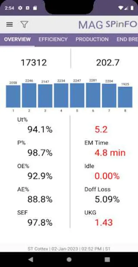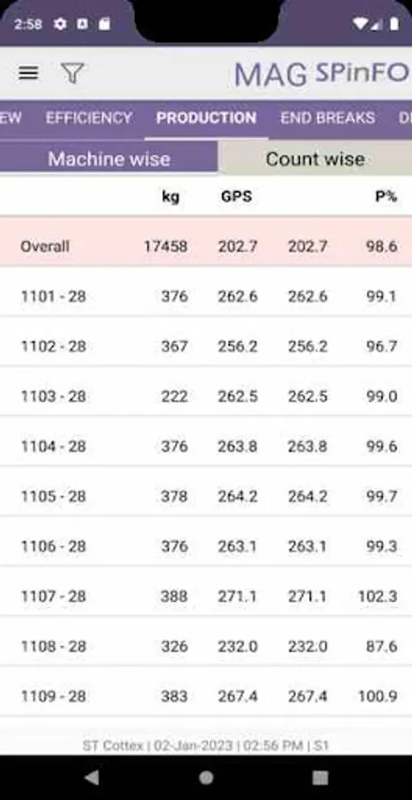 SPinFO Cloud mobile application helps to monitor remotely the complete performance of your spinning mill including the parameters viz production, efficiencies, end breaks, slips, rogues, idles, stoppages, doffs, power, air, temperature, RH, etc and to take prompt corrective / preventive action.