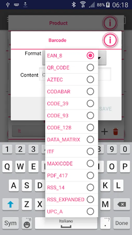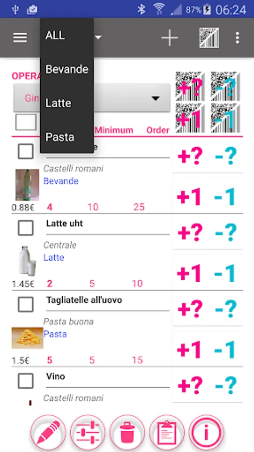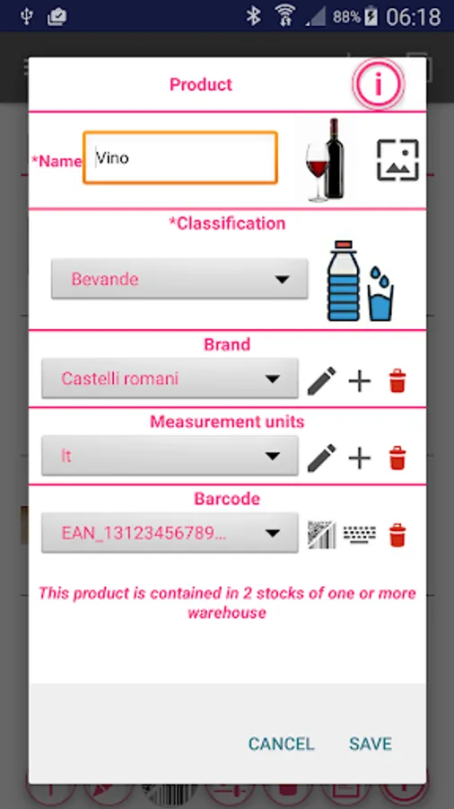 -PRODUCTS: you can assign the BRAND, enter an IMAGE, the TYPE, the UNIT OF MEASURE and the BARCODE or QR CODE, which can be read from the camera or with manual entry, in the formats: EAN_13, EAN_8, UPC_A, UPC_E, AZTEC, CODE_39, CODE_93, DATA_MATRIX, ITF, PDF_417, RSS_14, RSS_EXPANDED, UPC_EAN_EXTENSION, CODABAR, QR_CODE, CODE_128.