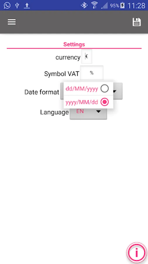 -CUSTOMIZATION: you can set the currency symbol, the symbol of VAT and the date format dd/mm/yyyy (ie day/month/year es.31/12/2016) or yyyy/mm/dd (ie year/month/day es.2016/12/31).