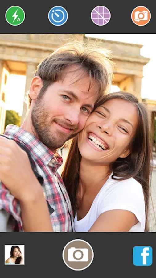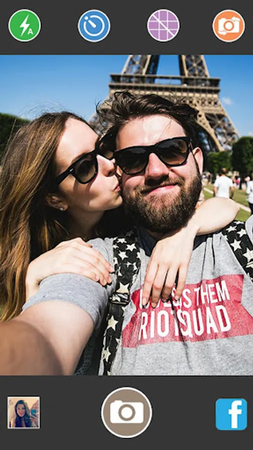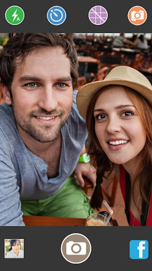Functions include timer 2s / 10s, grid, flash and facebook photo post.