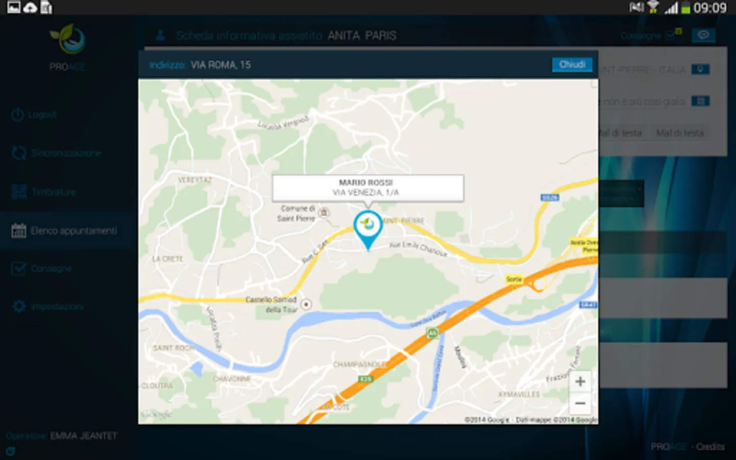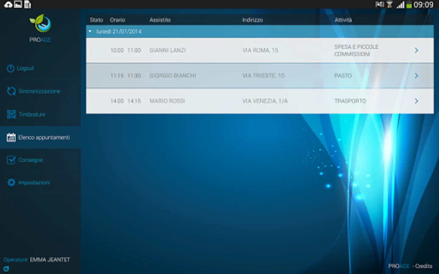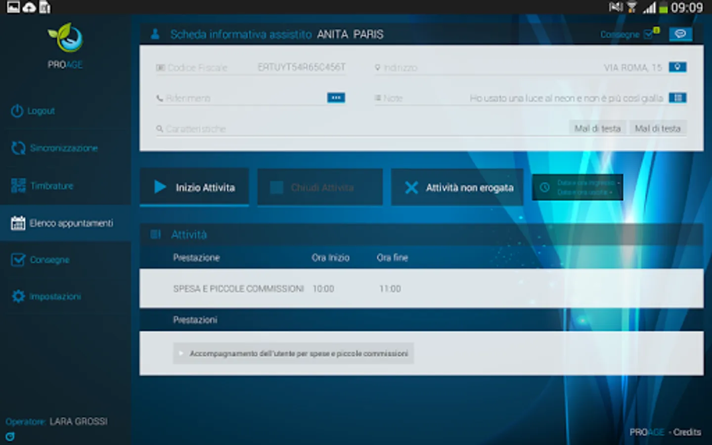 A specific application for the provision of home care services. By navigating a '"agenda" interactive assistant home displays information about the interventions and services to be provided during the day, see the information relating to assisted and communicate with your manager and colleagues through a structured system of notes and communications. In addition, by reading a bar code identifier of the assisted conveys the structure of the back-office information related to the services provided.