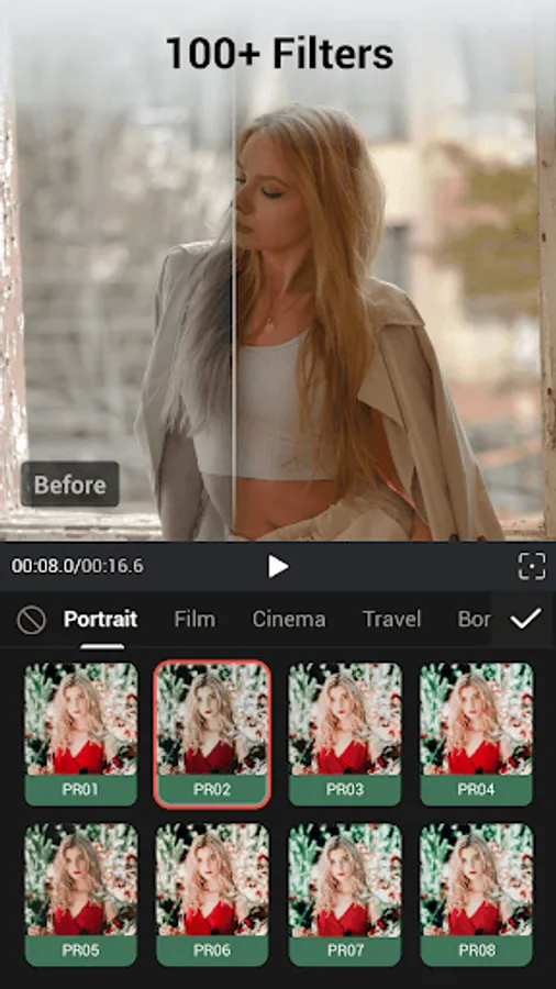 【🖼️Filter & Adjust】Edit videos with art filters deigned for portraits, food, scenery. Adjust brightness, contrast, saturation, sharpness, temperature, and other professional editing features.