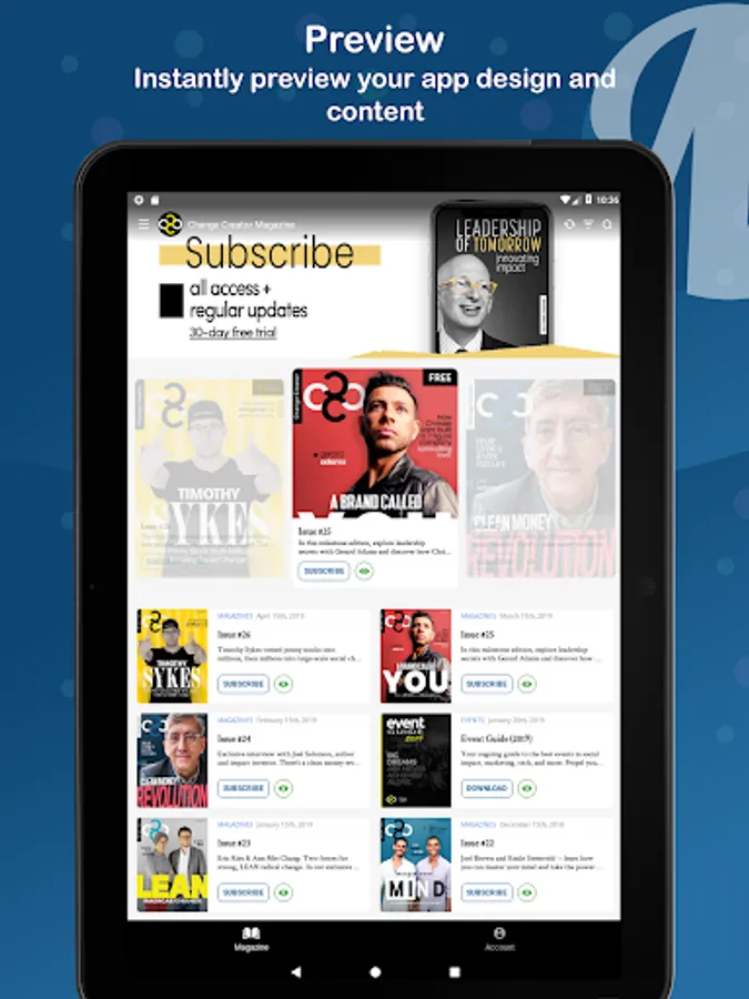You can signup for a free MagLoft.com account and get access to all our digital magazine building tools. Once you have either uploaded your PDF content or created some using our drag and drop editor, you can preview it using this app so you can see what it will look like before you publish.