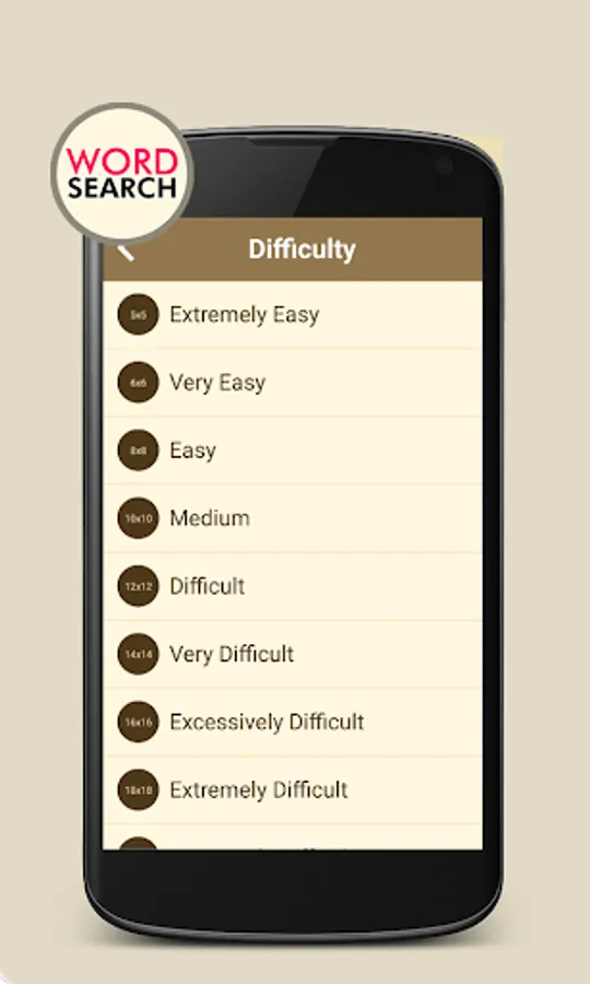 Difficult : The board is 12x12 and each game is harder. 33 Words in 5 Minutes A difficult feat for those up for the challenge. and this goes upto 20 x 20 Board with 30 Miuntes to search 80 Words .