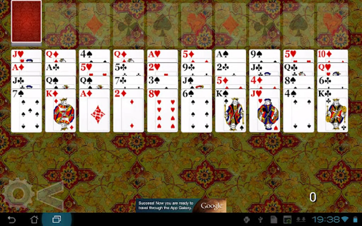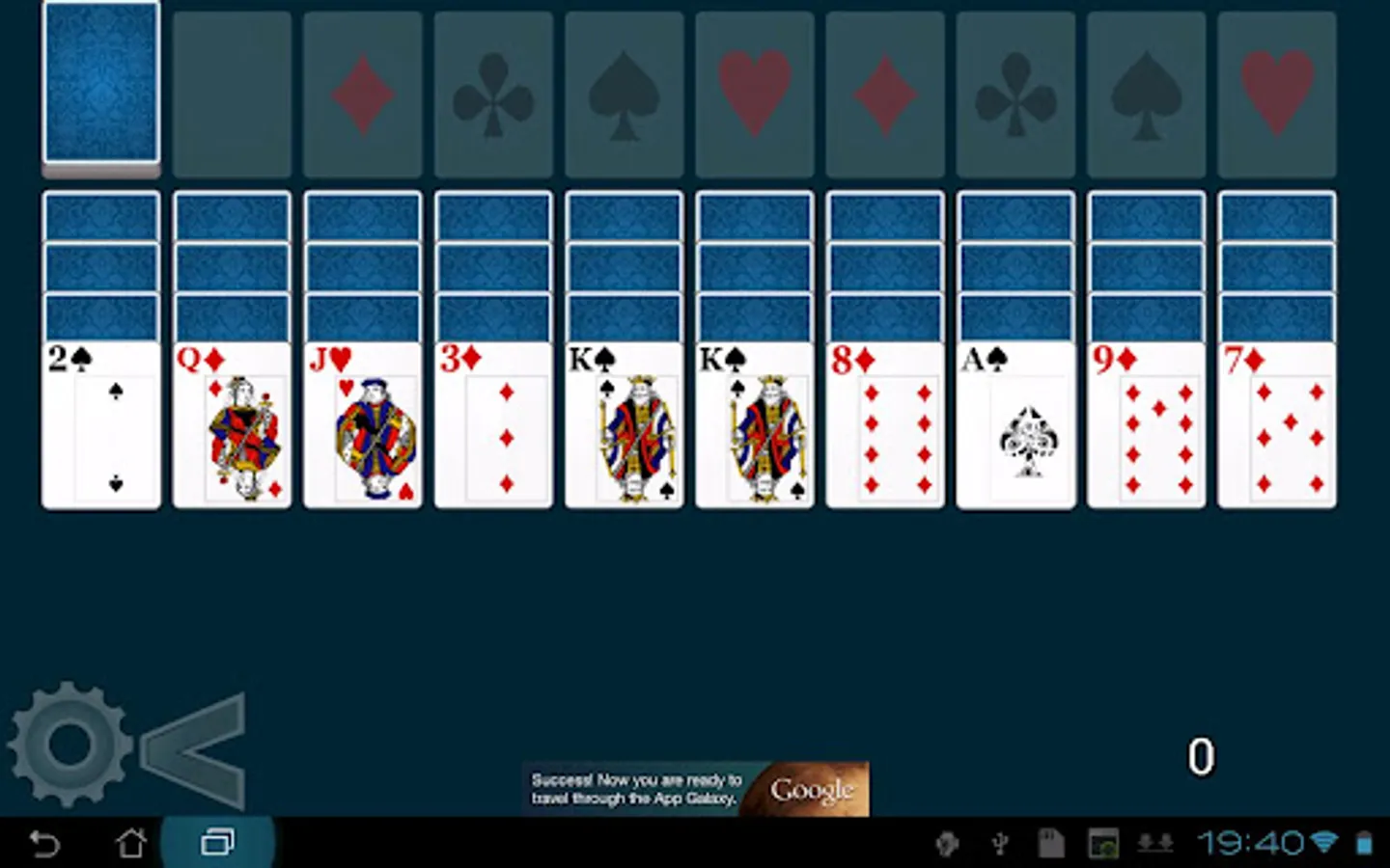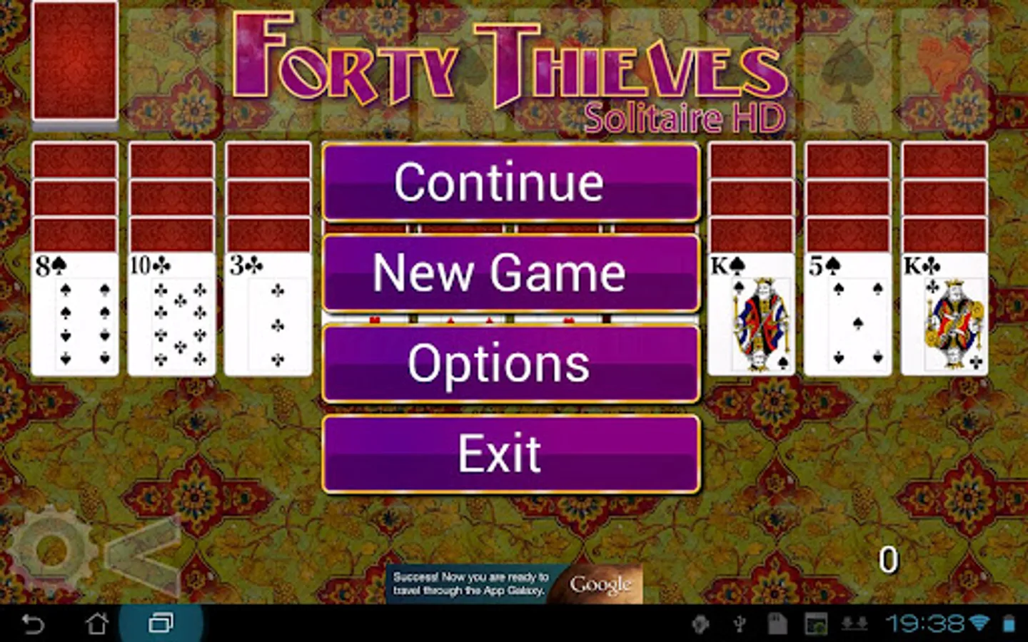 Forty Thieves is a challenging solitaire requiring some skill and patience. On easy level you can go through the stock three times which makes it much easier though. On hard level cards on the tableu that are not on top are hidden.