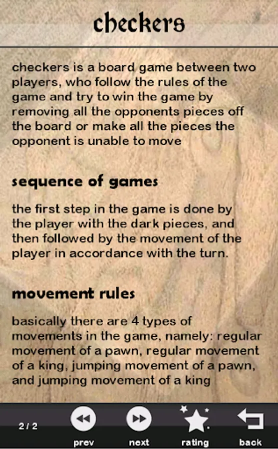Checkers is a board game played by two players, who tried to win the game by eliminating all opponents pawns or by making the opponent unable to move.