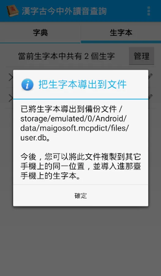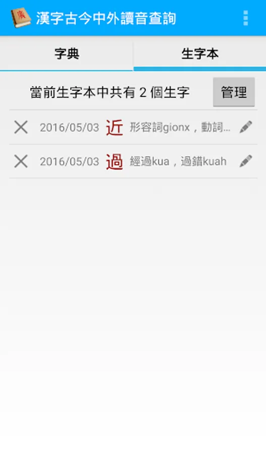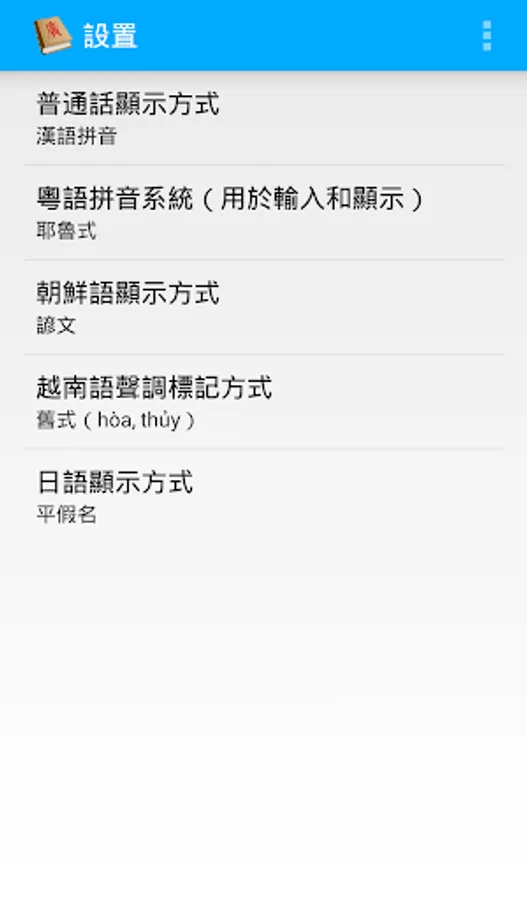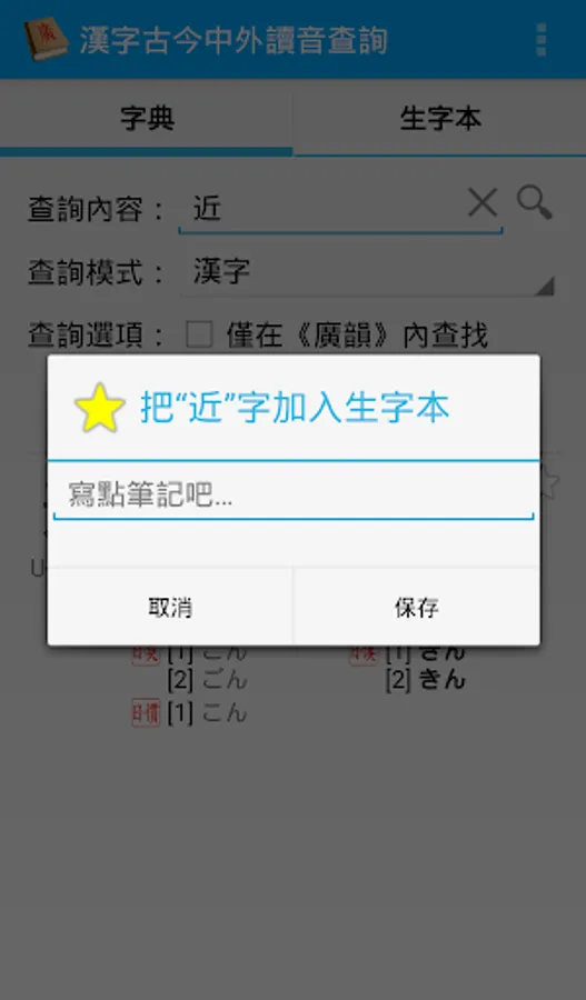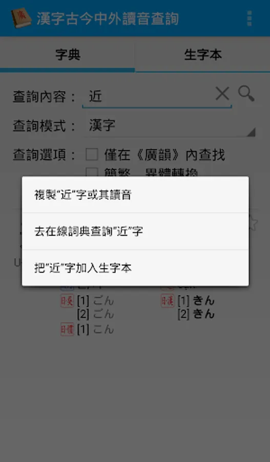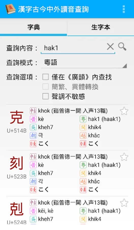 This is an Android application, with which you can look up the pronunciation of Chinese characters in multiple languages (including Middle Chinese, Mandarin, Cantonese, Shanghainese, Min Nan, Korean, Vietnamese and Japanese), or look up Chinese characters with a given pronunciation in these languages.