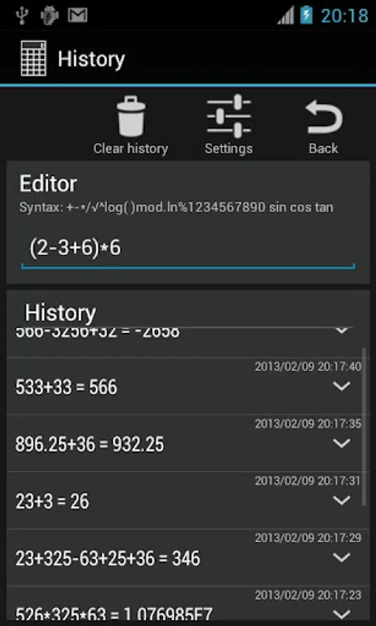- actions in the history menu (delete, copy equation, copy expression, copy result)