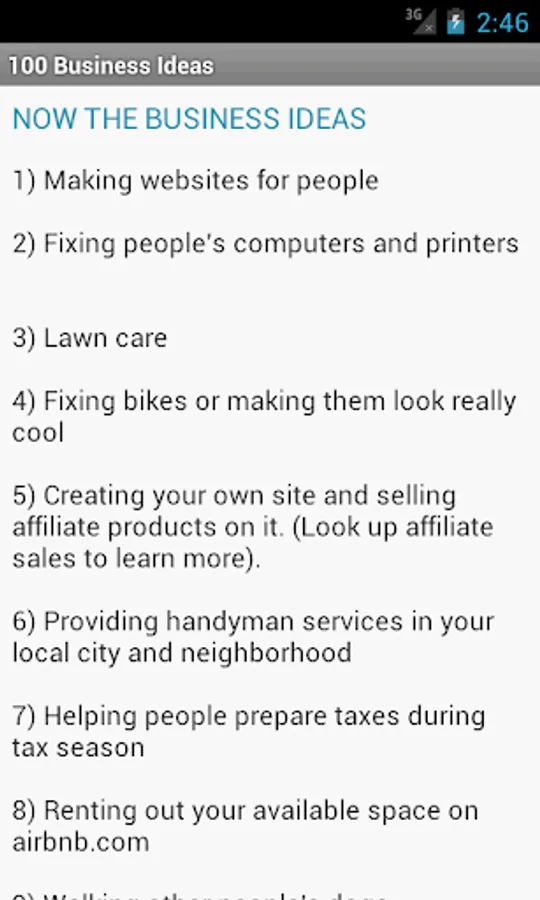 The app is split up in a few sections. The first section is about how to make money by starting any of the 100 common business ideas on the list that we have put together. The ideas there are common business ideas that most people can do.