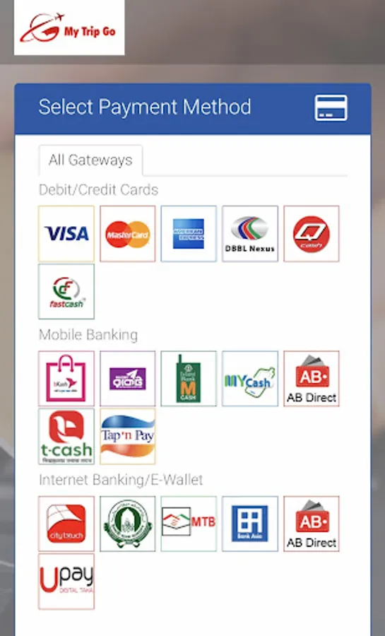 • My Trip Go enable you booking through by all the major card brands—Visa Inc., MasterCard Worldwide, American Express, Net Banking like- Rocket, Bkash, CityTouch, NexusPay, iPay, SureCash, Ebl SkyBanking