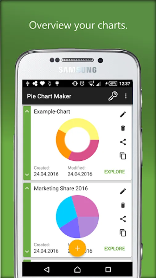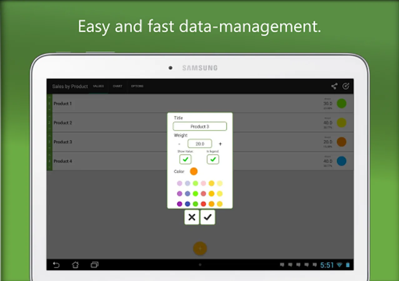 Pie Charts are a great way to communicate information visually. Pie Chart helps you to create, design and share own pie charts within minutes. Perfectly suitable for business and professional pie charts. With its intuitive design and controls Pie Chart is perfectly suited for mobile pie chart creation.