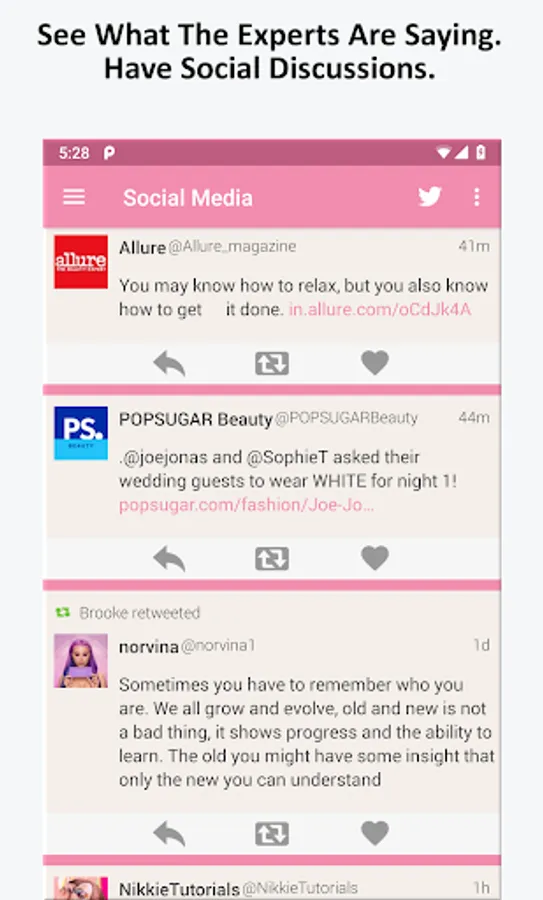 -- Discussion feed that aggregates news sources, and personalities from the Makeup & Beauty world into a single list of tweets, so you can hear what everyone has to say and respond to them in real-time.