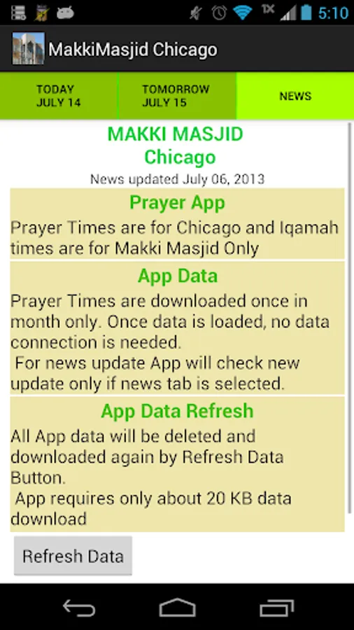 App provides Chicago Area Prayer times 5 Daily Islamic Prayers.