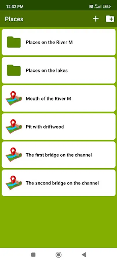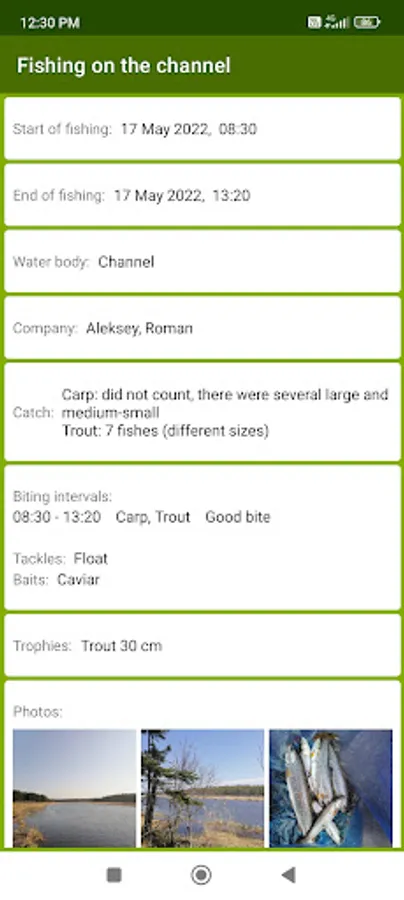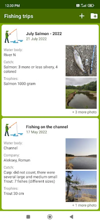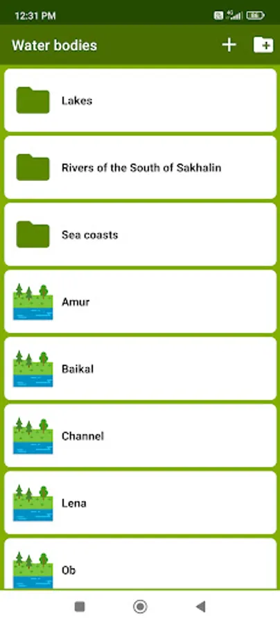 - Creation of folders in the sections "Fishing trips", "Water bodies", "Fishes", "Tackles", "Riggings", "Lures", "Baits", "Feedings", "Places", "Notes", "Web sites"