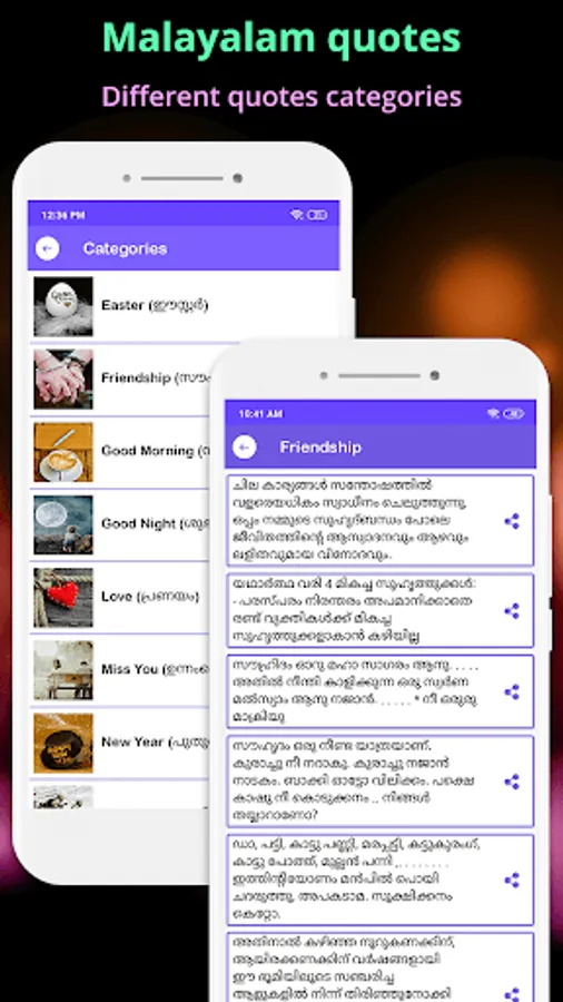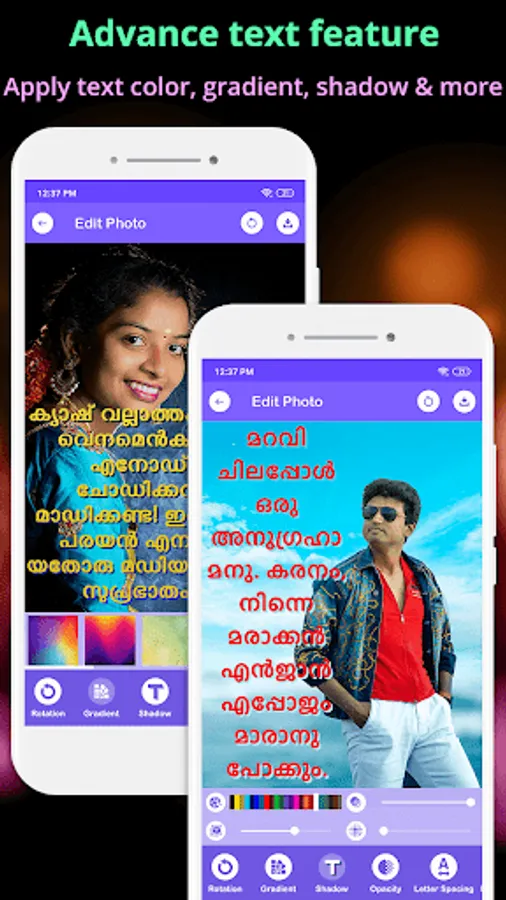 Write your emotions in your favorite Malayalam language on your photos or backgrounds and share your photo with Malayalam text with your friends and family via social media.